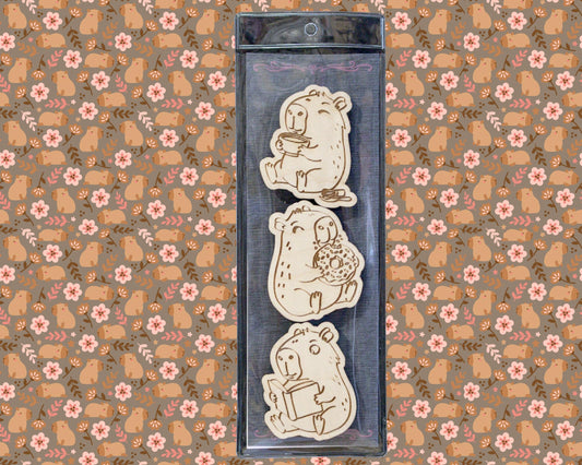 Capybara Wood Magnet Set - Set of 3 - Eating Donut, Reading Book, Sleeping - Cute Animal Fridge Decor, Gift for Capybara Lovers