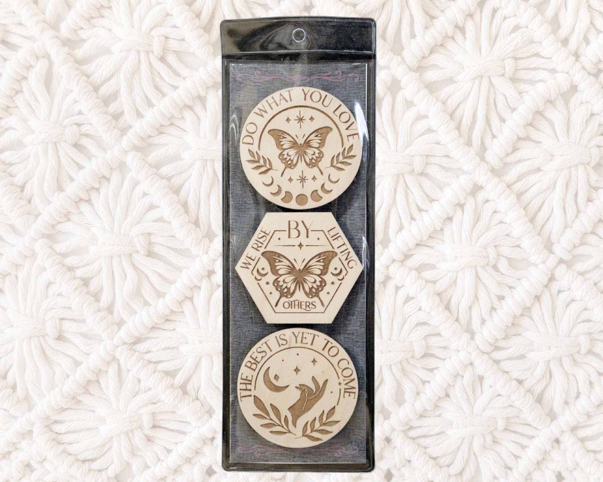 Elevate your daily routine with these handcrafted wood magnets, designed to bring a sense of peace, motivation, and "earthy chic" to your space. Whether you’re pinning up a grocery list or a cherished photo, these magnets serve as gentle daily reminders to stay grounded and inspired.