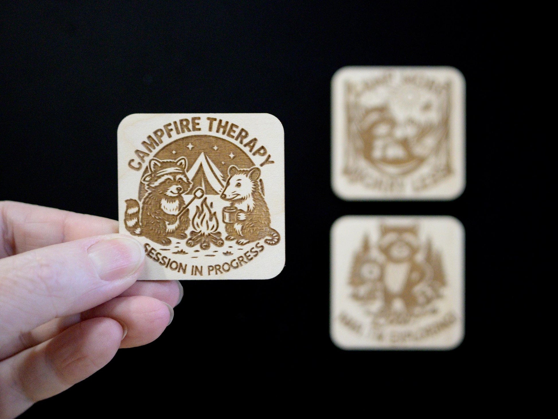 Camping Critters Wood Magnets - Set of 3 - Raccoon and Possum Camping - Trash Panda Fridge Decor