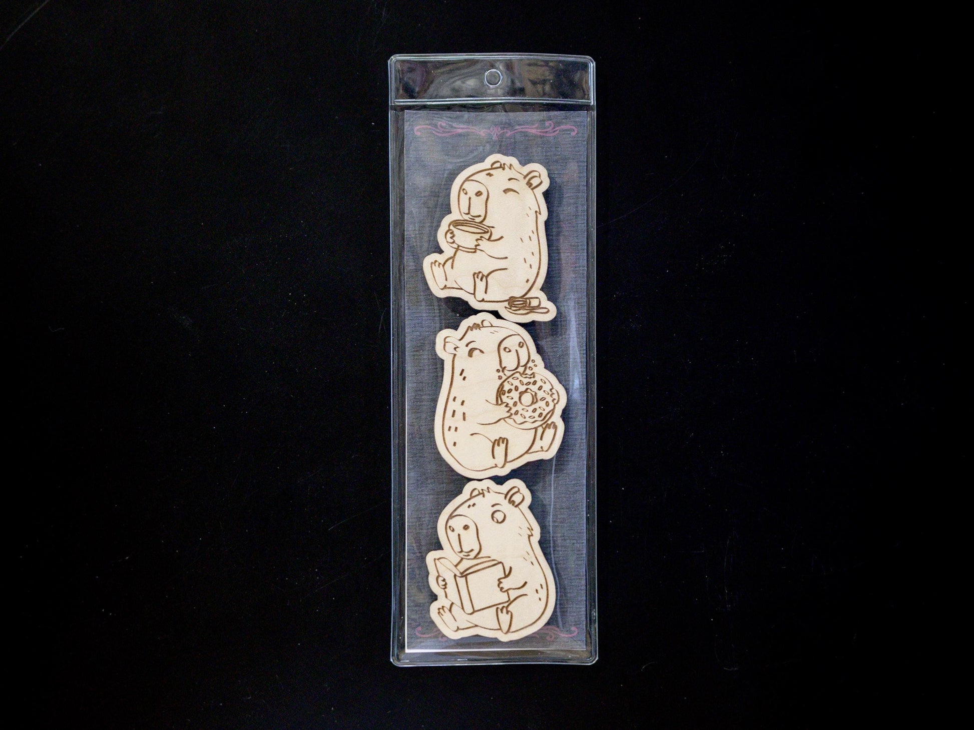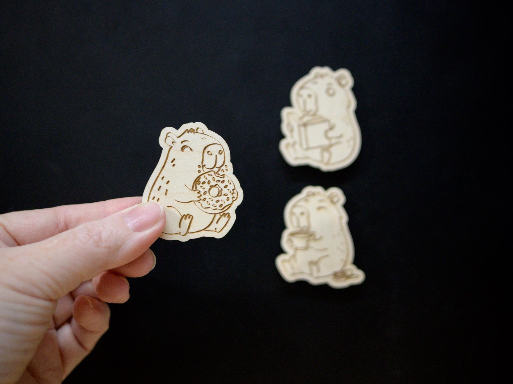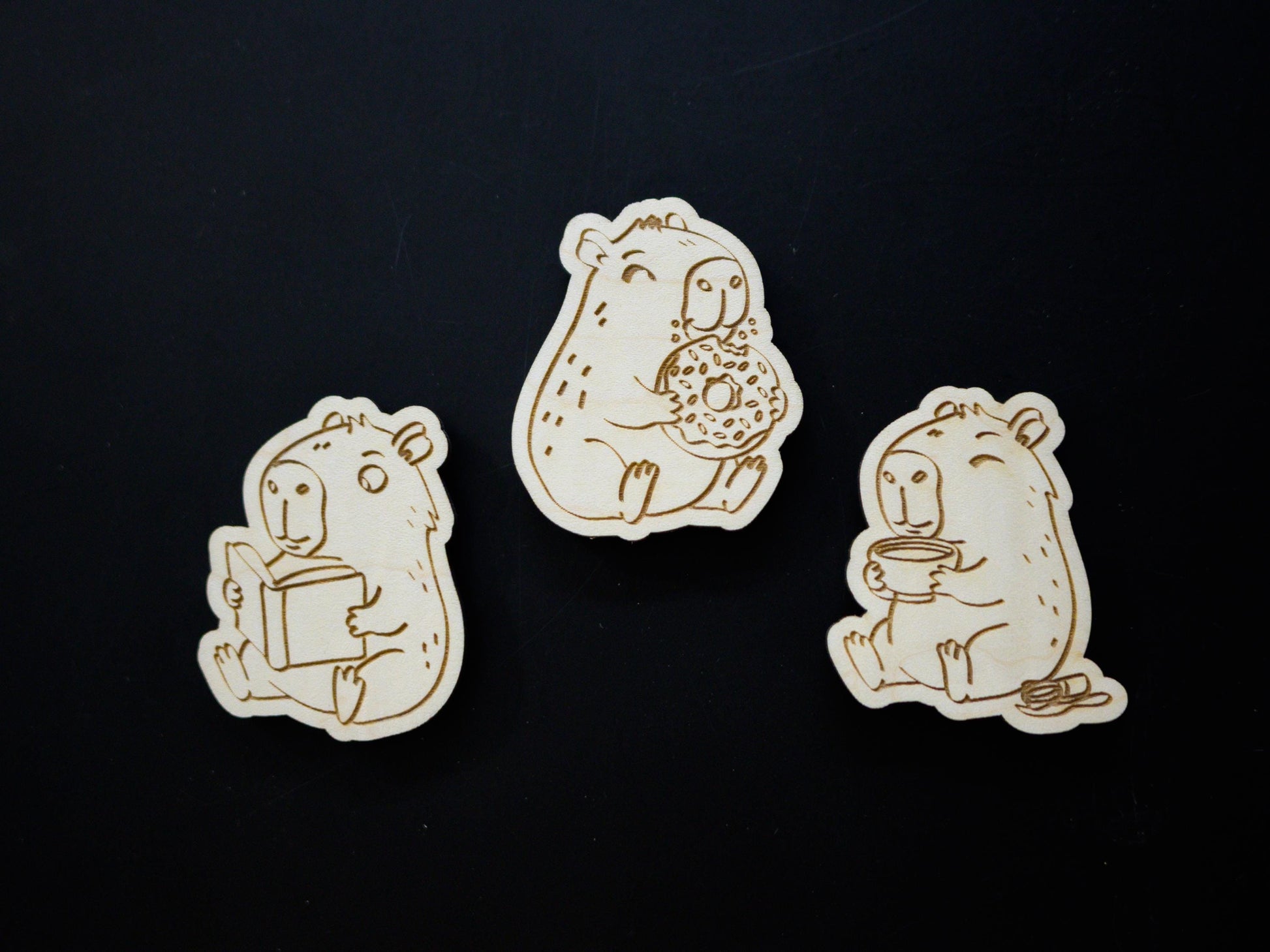 Capybara Wood Magnet Set - Set of 3 - Eating Donut, Reading Book, Sleeping - Cute Animal Fridge Decor, Gift for Capybara Lovers