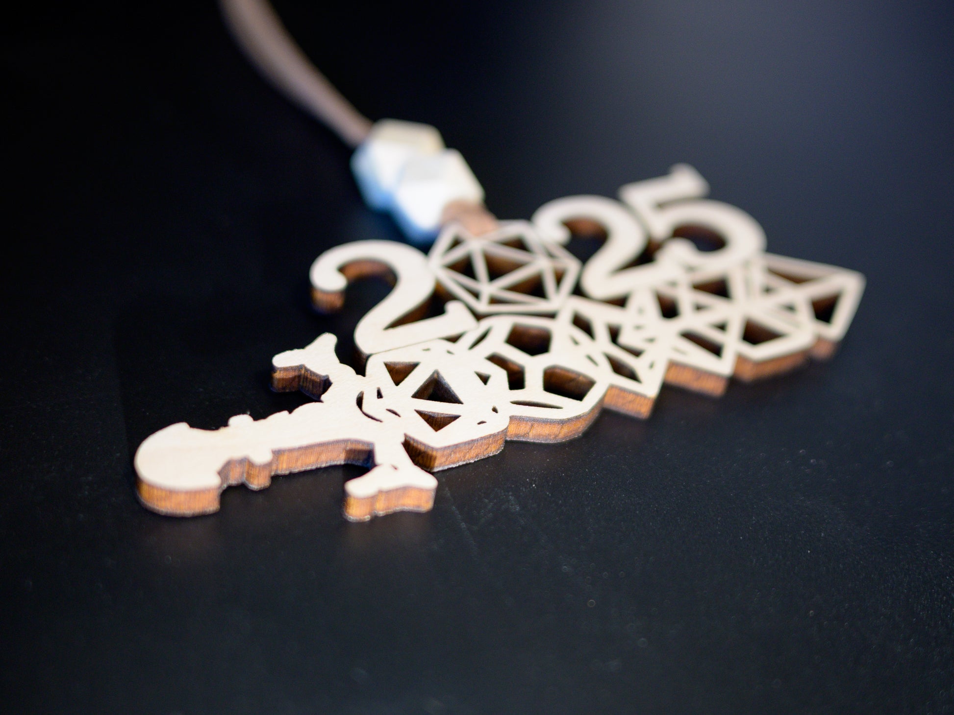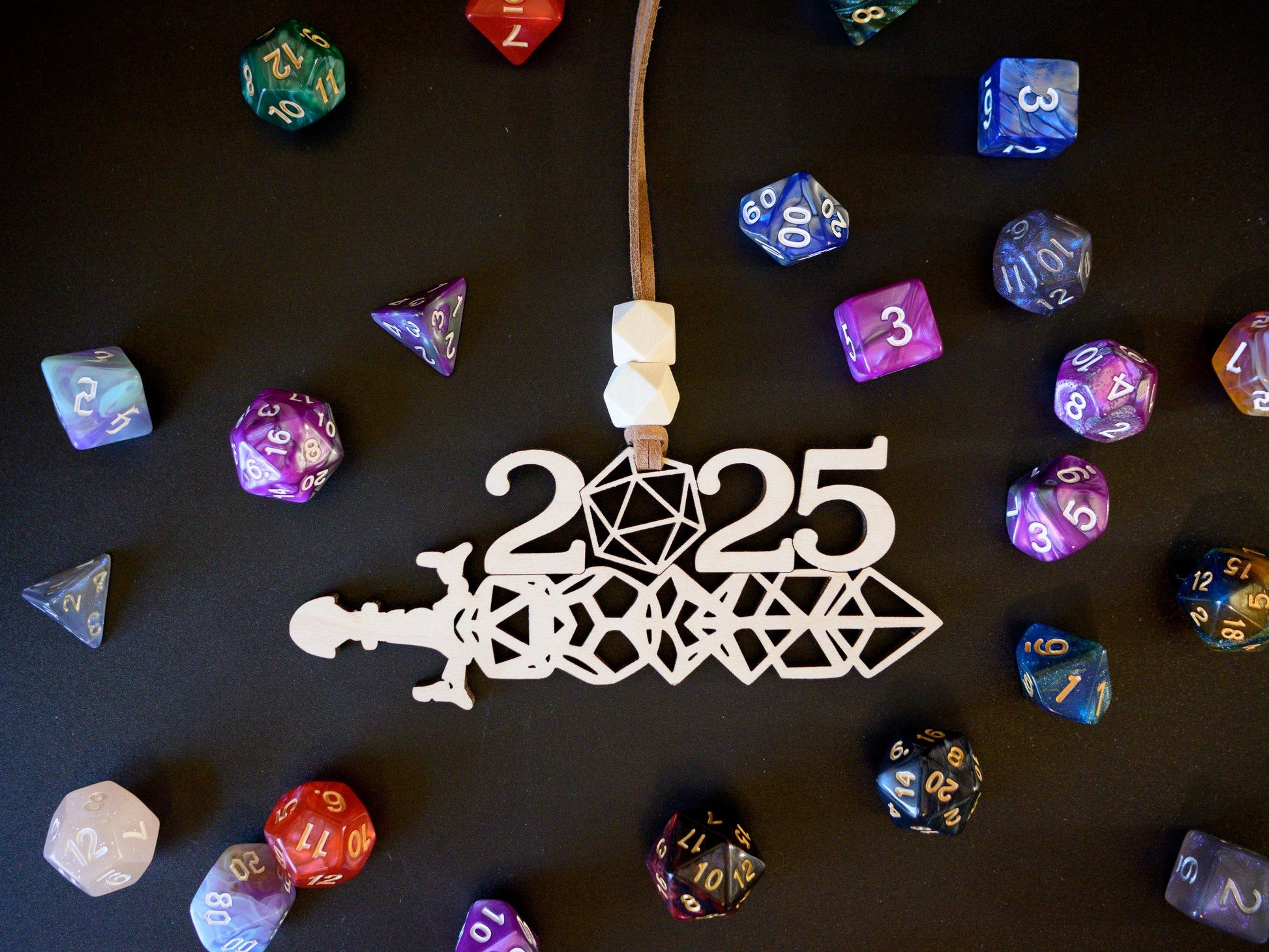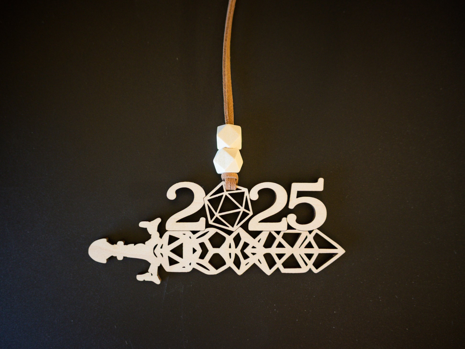 This maple Dungeons and Dragons 2025 ornament has a D20 representing the zero and a dice sword underneath. It's a fun ornament for any DnD lover this holiday season. Great stocking stuffer! You can also tie it to a gift to make your present extra special.