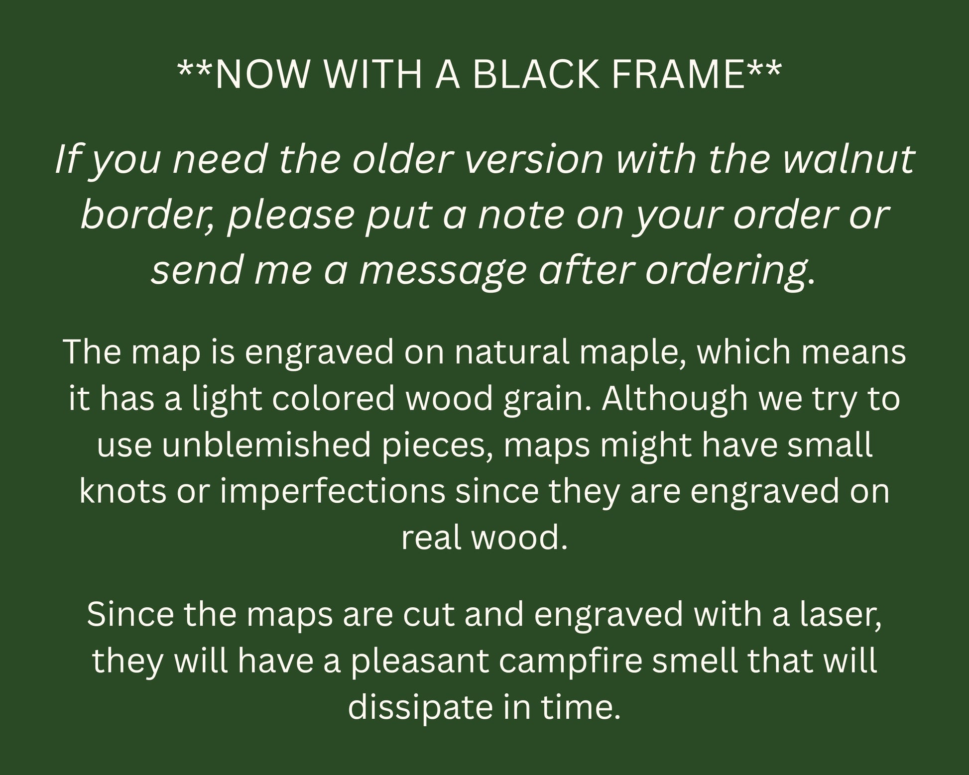 Since the maps are cut and engraved with a laser, they will have a pleasant campfire smell that will dissipate in time.