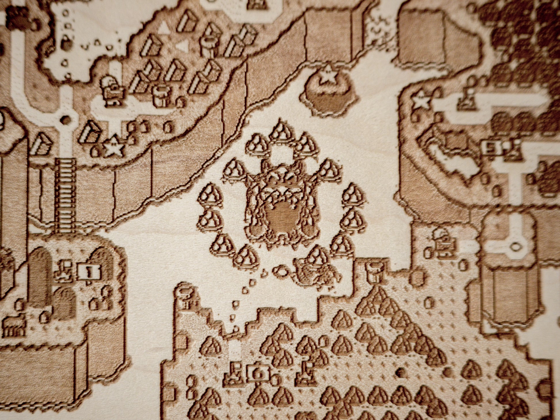 Bring the world of Mario to life in your space with this finely engraved wooden map of Super Mario World. This is a detailed and display-worthy piece for Nintendo fans, gamers, and collectors alike.