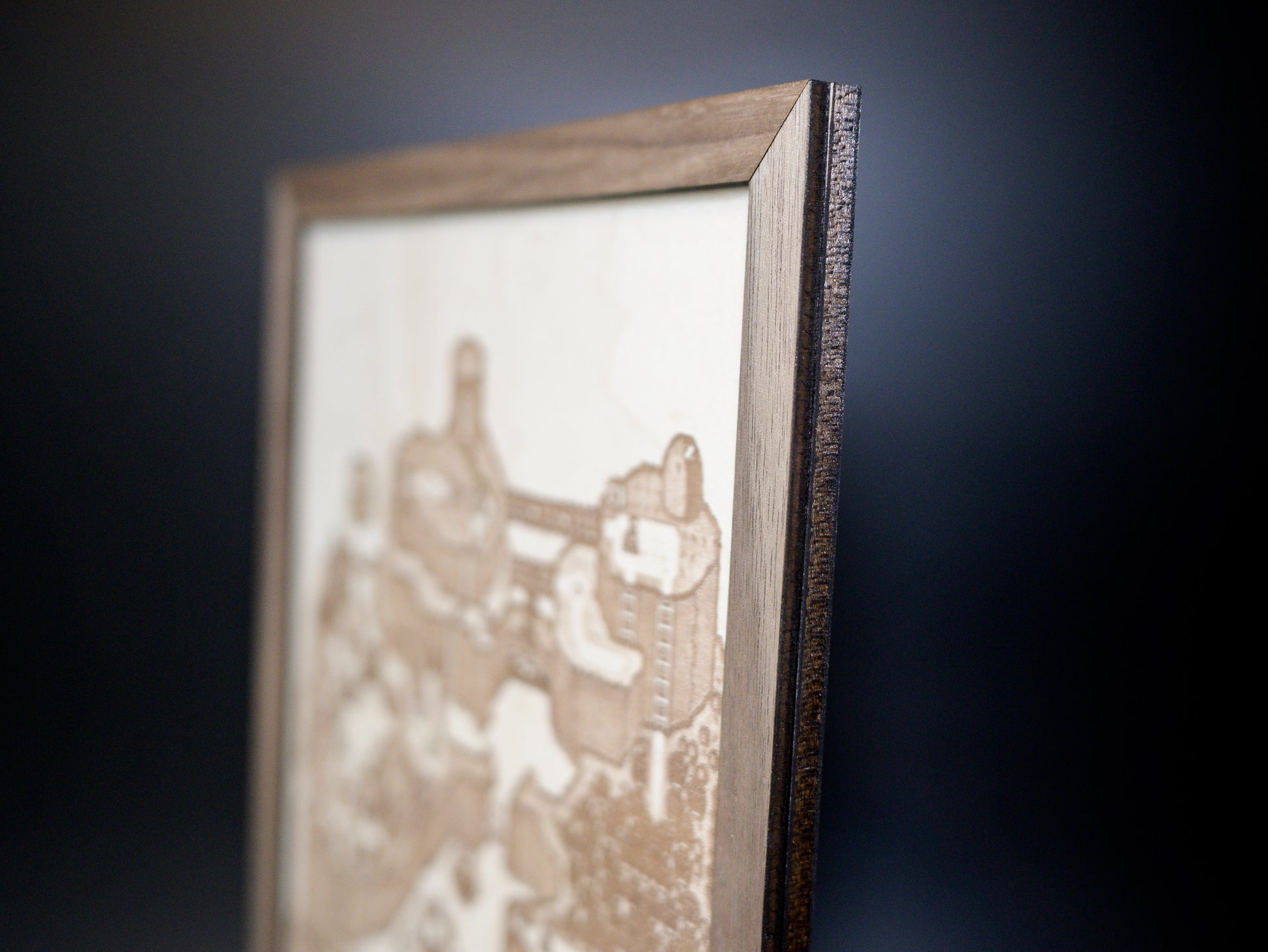 A rich walnut wood border frames the map, adding contrast and depth for a finished, premium look.